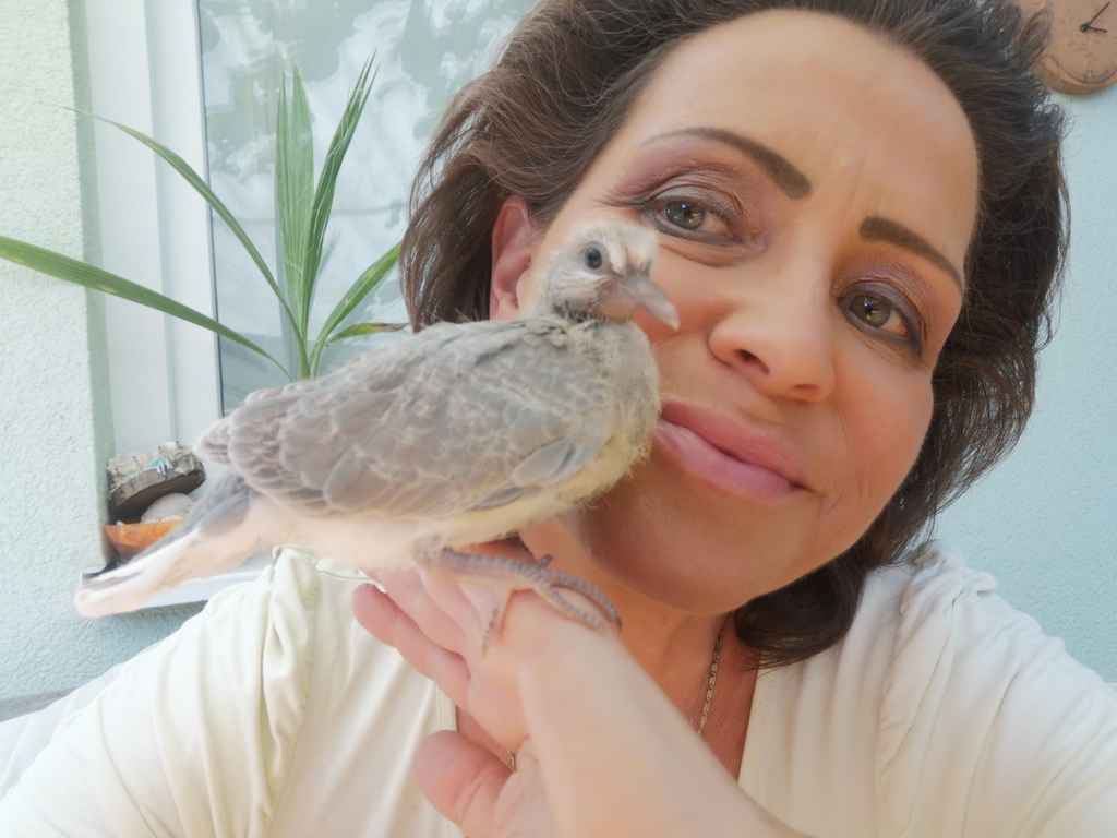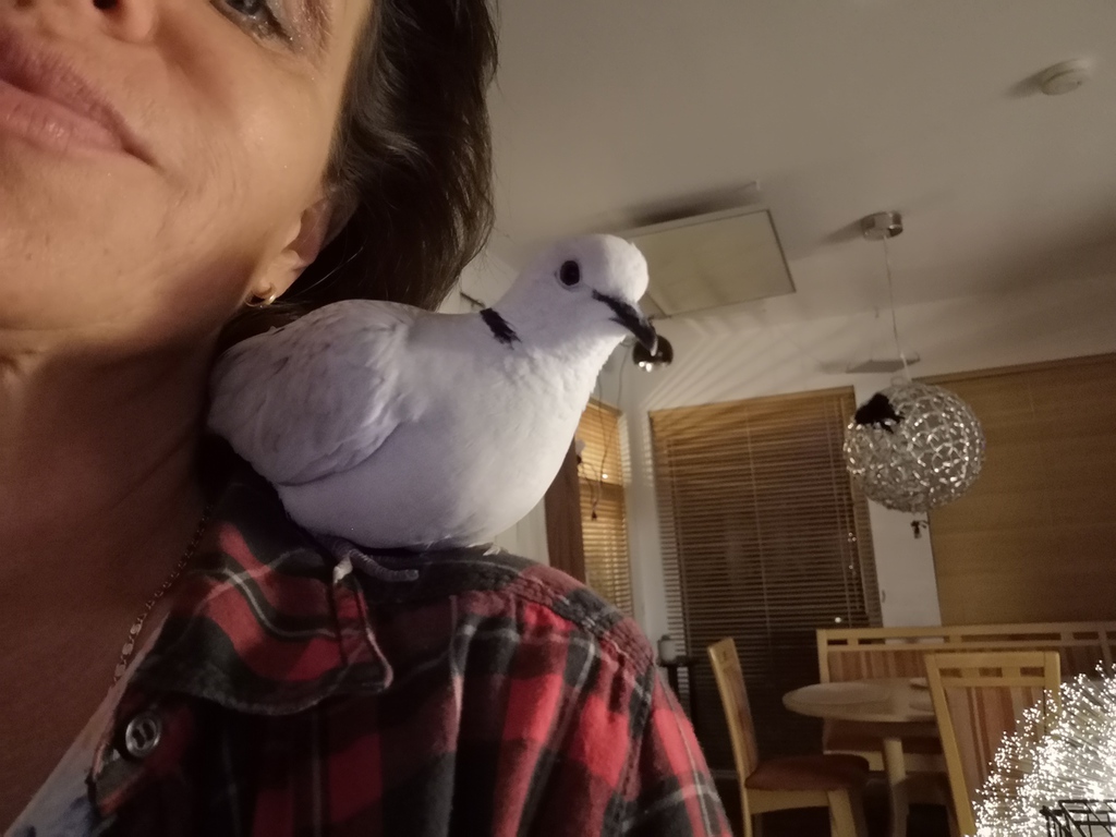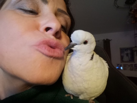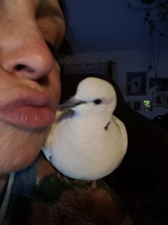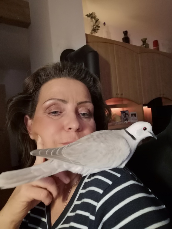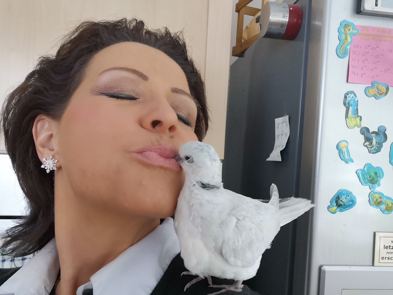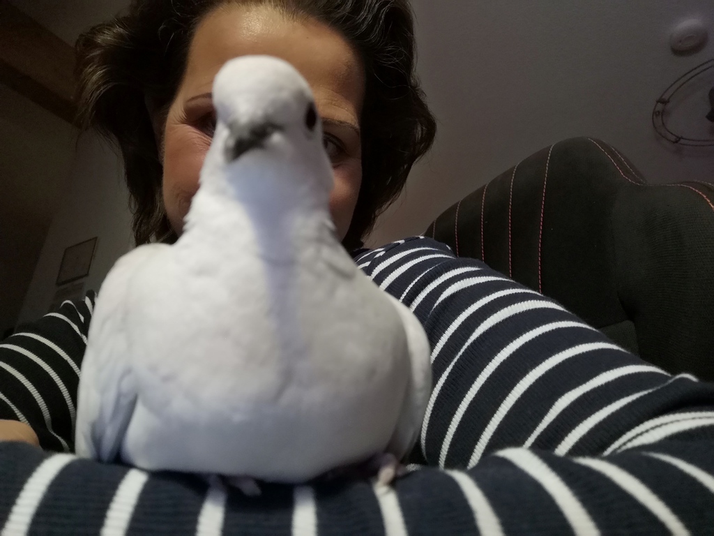 Smiley ist das herzigste Wesen ,was es in der Vogelwelt gibt. Er ist so lieb und zutraulich, Er hat vor nichts Angst, kein Staubsauger, kein Hund oder lautes Gerät kann ihn aus der Ruhe bringen. Er ist ein guter Wachvogel - er meldet - gurrt sogar in der Nacht , wenn ein Auto zufahrt und jemand zum Haus geht - oder wenn ein Fenster geöffnet wird. Er gurrt einfach immer und liebt nur mich. Alle anderen Täubinnen müssen sich hinten anstellen. Er ist einfach unbezahlbar!!!! Und ein wunderbarer Papa ,für alle seine Küken.